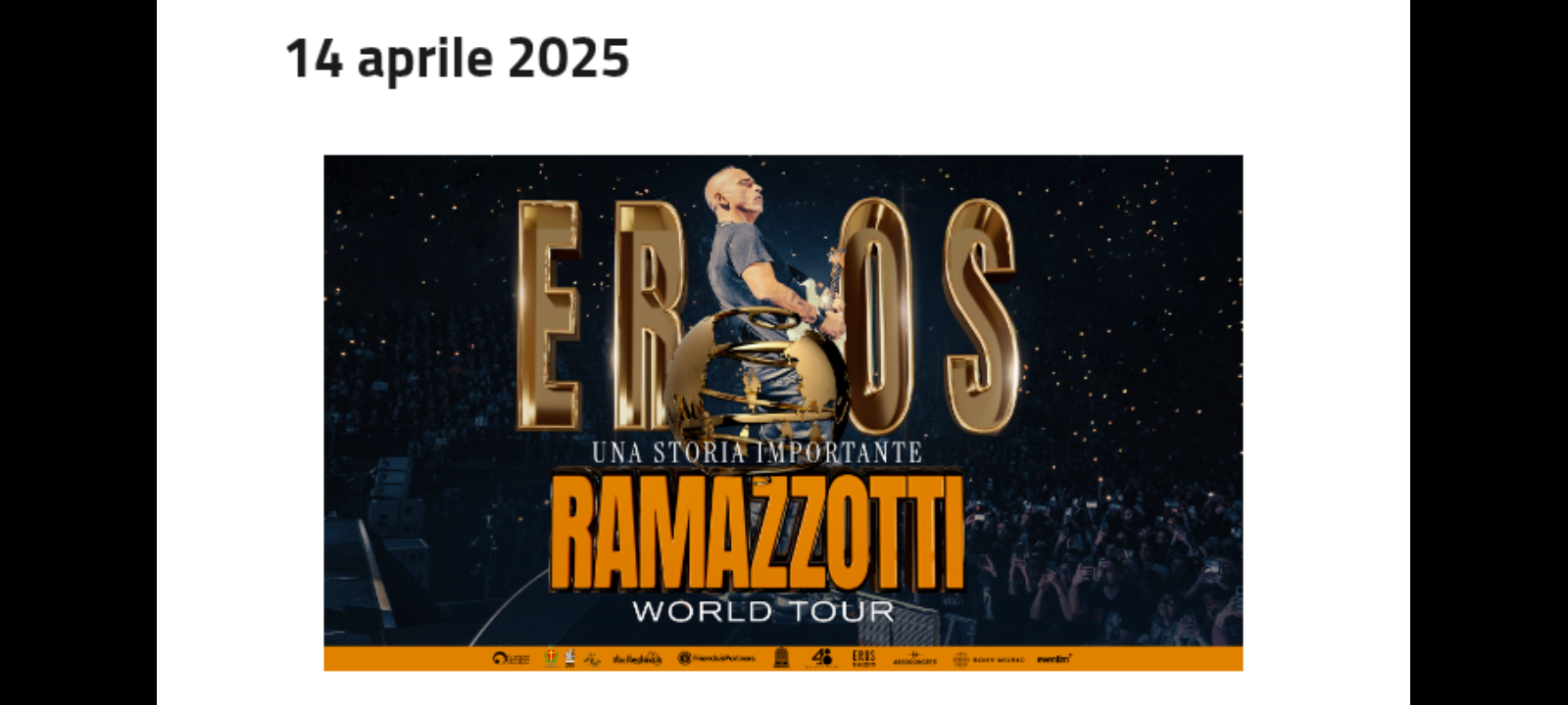 “Una Storia Importante World Tour – Il Nuovo Viaggio Globale in 4 Leg” di Eros Ramazzotti: il tour segna anche l’attesissimo ritorno di Eros negli stadi italiani. Tra gli appuntamenti immancabile quello in Sicilia, il 20 giugno 2026 allo Stadio Franco Scoglio di Messina. L’evento sarà realizzato da Puntoeacapo Srl in collaborazione con Il Botteghino e con il Comune di Messina.