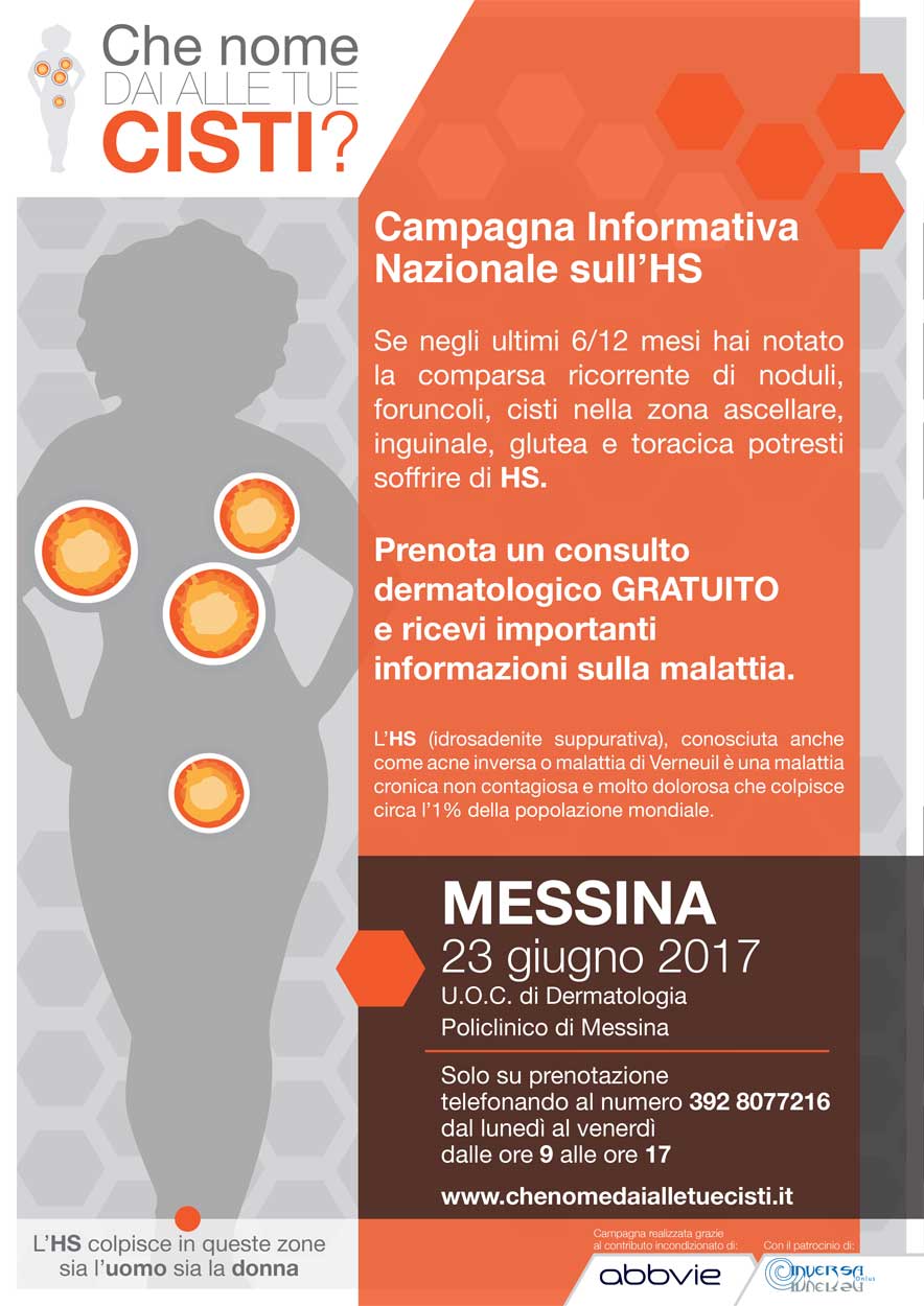 Venerdì 23 giugno al Policlinico di Messina presso l’U.O.C.di Dermatologia (Via Consolare Valeria, 1 – PADIGLIONE H – IV Piano), diretta dalla Professoressa Serafinella Cannavò, chi soffre di HS potrà usufruire di una visita gratuita, previa prenotazione.