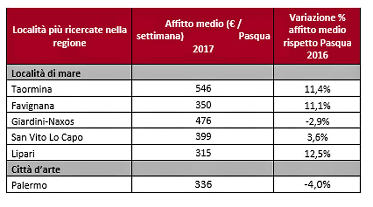 Per quanto riguarda la Sicilia, tra le principali località di mare richieste nella settimana di Pasqua, si segnalano la più costosa Taormina (546€ a settimana per l’affitto medio di una casa vacanza), Favignana (350€), Giardini-Naxos (476€), San Vito Lo Capo (399€) e Lipari (315€). Per chi invece non ama il mare e preferisce le “città d’arte”, Palermo (336€), è la meta per eccellenza in regione, al quinto posto nella classifica nazionale.