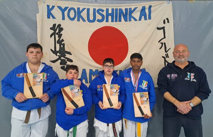 il Team italiano in Olanda, dell’ Accademia Italiana Kenpokai Karate Do, composto da Giacomo De Rosa, Anthony Costa, Samuele Famà, il neo Campione Europeo della cat. -60 Kg. Richard Appuhamy ed il D.T. della spedizione, Hanshi Ibo