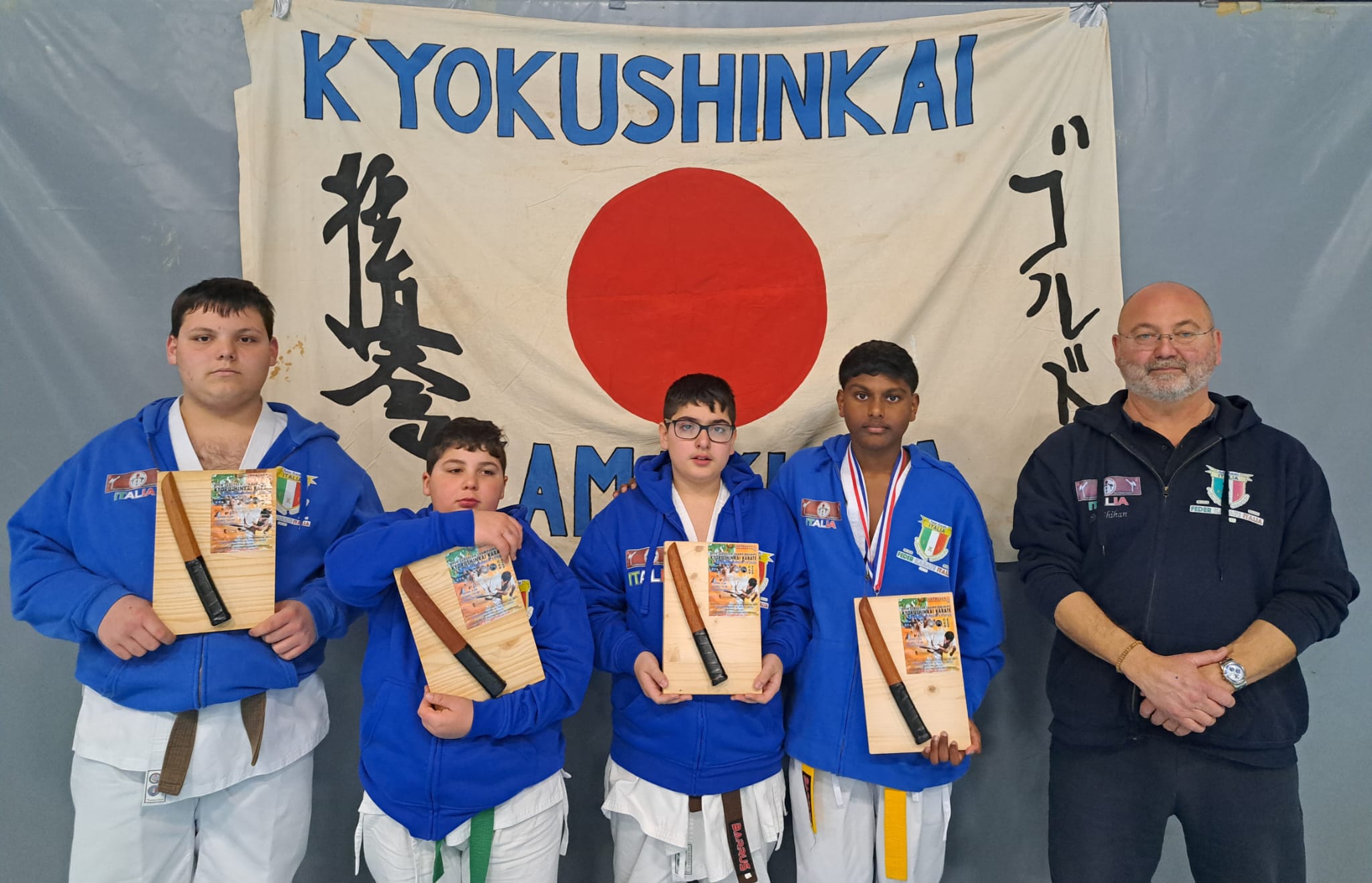 il Team italiano in Olanda, dell' Accademia Italiana Kenpokai Karate Do, composto da Giacomo De Rosa, Anthony Costa, Samuele Famà, il neo Campione Europeo della cat. -60 Kg. Richard Appuhamy ed il D.T. della spedizione, Hanshi Ibo