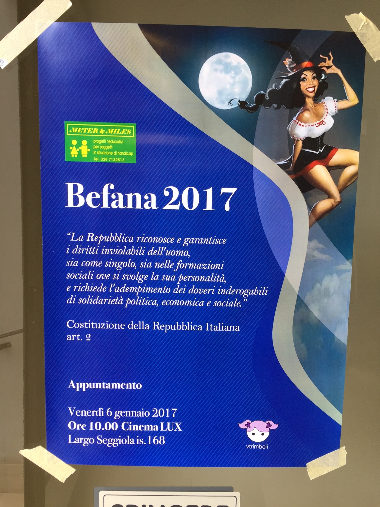 Come consuetudine, la Befana 2017 targata Meter&Miles, ha portato i suoi doni, traendo spunti essenziali dall’articolo 2 della Costituzione che “riconosce e garantisce i diritti inviolabili dell’uomo, sia come singolo sia nelle formazioni sociali ove si svolge la sua personalità, e richiede l’adempimento dei doveri inderogabili di solidarietà politica, economica e sociale”.
